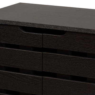 Organize your shoe collection in modern style with the stunning Ernest shoe cabinet. Made in Malaysia, the Ernest is comprised of sturdy wood showcasing a rich dark brown finish. Six internal shelves provide space to store up to 18 pairs of shoes, depending on size. Requiring assembly, the cabinet features open slatted doors to enable air circulation and deter odor buildup. gray finished feet complete the look. A handy piece brimming with contemporary style, the Ernest shoe cabinet is an excellent addition to any home. Dimensions: 38.4″ High x 23″ Wide x 14″ Deep; Top Five Shelves: 5.3″ High x 21.7″ Wide x 11.6″ Deep; Bottom Shelf: 5.2″ High x 21.7″ Wide x 11.6″ Deep; Legs: 2.7″ High;