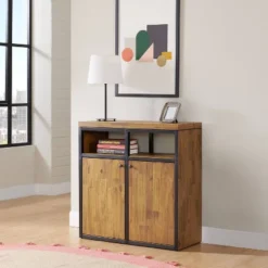 Keep your entryway or hallway organized with this shoe storage cabinet. The shoe storage cabinet is both beautiful and functional, providing ample storage and style for your home’s entryway or hallway. Made from acacia wood and metal ,the mix of materials gives this cabinet an industrial, modern look. Behind the two doors are two adjustable shelves to keep shoes from cluttering your floors. The cabinet can also be used for books, bins, scarves, gloves or other accessories. With a streamlined, modern design that doesn’t take up too much room, this storage cabinet is a great choice for smaller spaces.