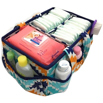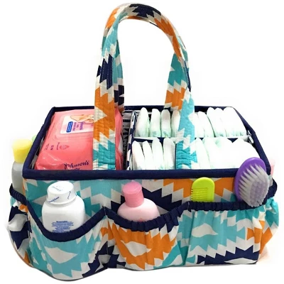 Add organization to any area of your home with the portable Nursery/Toddler Storage Caddy by Bacati. Perfect for dressers and changing stations, this lightly padded caddy has 8 outer pockets and a removable “T” separator for maximum versatility. The soft cotton percale fabric with stiffner inside keeps the shape intact, lining and handles feature a padded with polyfilled and cordinating trim. Keep diapers, wipes and other necessities tidy while traveling from room to room. Caddy also functions as an organizer for crafts, picnics, pet supplies, etc. Measures 12.5 in x 6.25 in x 8.5 in.