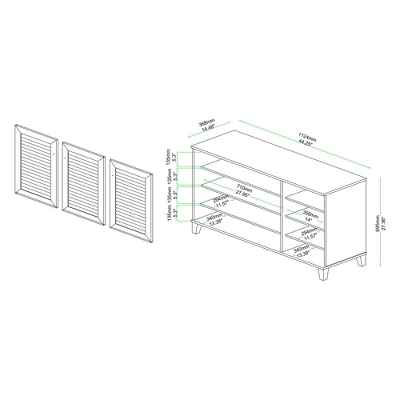 - Overall Dimensions: 27.40″ High x 44.30″ Wide x 14.50″ Deep; Larger Shelf Dimensions: 28.00″ Wide x 11.60″ Deep x 5.30″ High; Smaller Shelf Dimensions: 14.00″ Wide x 11.60″ Deep x 5.30″ High; Legs: 3.50″ High;