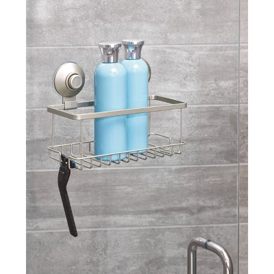 Organize your shower in style with the iDesign Everett Hanging Basket. This bathroom organizer provides storage space for a variety of bath and shower necessities to keep items such as shampoo and conditioner bottles, body wash, soap, shaving cream, toothbrushes, toothpaste, razors, and more off the floor. The open design provides proper water drainage and helps wet items dry quickly in the shower. This storage basket includes two suction cups with push lock technology to provide a strong hold on any clean, smooth surface including tile, glass, mirrors, fiberglass, and metal. To install, simply press firmly and push to attach the suction cups to the shower wall – no drilling or hardware required! The suction cups move side to side to avoid grout lines, and the easy release tabs allow for quick reorganization when you need to move the basket. The rust-resistant steel construction with powder-coated satin silver finish is made to last and stands up to every day use. Measuring 9.1″ x 4.53″ x 3.63″, this storage basket is ideal for adding organization in compact spaces. With iDesign by iDesign, you can #LiveSimply every day.