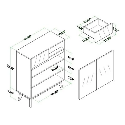 - Overall Dimensions: 39.00″ High x 31.50″ Wide x 13.75″ Deep; Storage Dimensions: Drawer: 12.50″ Wide x 11″ Deep x 4.5″ High; Top Shelf: 30″ Wide x 9.40″ Deep x 9.75″ High; Middle Shelf: 30″ Wide x 9.50″ Deep x 7″ High; Bottom Shelf: 30″ Wide x 12.40″ Deep x 7″ High Legs: 6.75″ High;