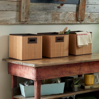 These decorative and functional storage cubes serve as a simple and convenient storage solution for living rooms, bathrooms, kitchens or any other space in your home. Measuring just over 10 inches by 10 inches by 9 inches tall, these storage cubes offer plenty of space for magazines, towels, toys, craft supplies, hats, gloves or other loose items. This size also fits perfectly inside any standard bookcase or cabinet. Stored items stay effectively out of sight, yet remain readily available for easy and immediate access when you need them. These stylish storage cubes are constructed from sturdy yet lightweight bamboo that offers practicality and an aesthetically-pleasing accent piece with limitless applications. The cubes are lined on the inside with durable polypropylene fabric for easy cleanup and care (simply wipe with a damp cloth as necessary). Each cube has two cutout handles for easy transport as well as a removable fiberboard base for added stability. To set up, simply unfold the one-piece design and pop the base into place. When not in use, these cubes fold flat for easy storage. The storage cubes come in packs of 3 and boast an eye-catching yet versatile appeal.