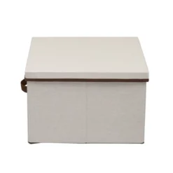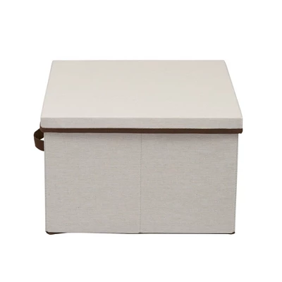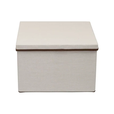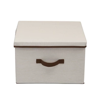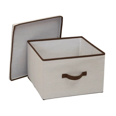 This versatile and stylish Square Storage Box with Lid from Household Essentials offers exceptional organizational possibilities for any closet or storage area in your home. Its classic design and natural color offer an aesthetically pleasing alternative to oft-cluttered areas of your home. Bedrooms, bathrooms, attics, basements–these boxes offer simple storage when and where you need it. They are perfect for blankets, accessories, off-season clothing, towels, craft supplies and anything else in need of order and organization. The box is made of a durable poly-cotton canvas blend which offers exceptional protection from dirt, dust, cobwebs, moths, and other common household elements that can damage your stored items. For added convenience, each box includes a single handle for easy and immediate, one-handed access when stored on a tall shelf or under a bed. Decorative and practical, this Square Fabric Storage Box with Lid is the perfect way to get your clutter organized and out of the way.