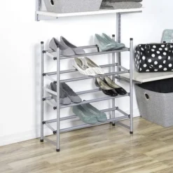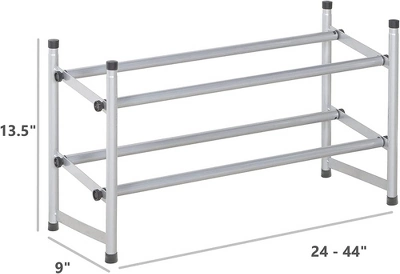- EXPANDABLE: this angled shoe rack is expandable to fit in closets, garage, bedroom, mudroom. It is nice enough to use in an entryway. Expands from 24 to 44-inch so can fit different widths. Customizable for virtually any space in your home. Put 2 racks side by side and stack up to 4 high to create a wall of shoe storage