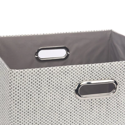 This sturdy storage basket is the perfect addition to your childโs nursery or playroom. It is made of gray and white cross weaved straws and has a trendy gray polyester lining inside. There are two silver handles on the sides for carrying. It easily folds up for compact storage when not being used. It is sized at approximately 12 1/2โ X 11โ X 9โ. Spot clean only