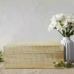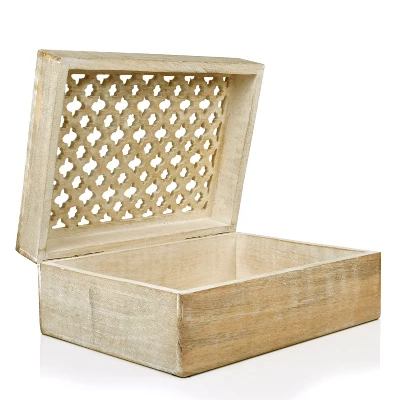 - This Wooden Storage Box stands out in its intricate hand-carved trellis design and white finish.