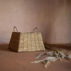 Unique in shape, a handwoven basket crafted from natural seagrass by artisans using traditional techniques. The grasses are intricately woven around a metal structure to create a unique tapered square shape and finished with sturdy handles to allow you to lift when full. This is a great basket for stylish organization as well as a decorative accent to infuse some natural boho elements to your space.