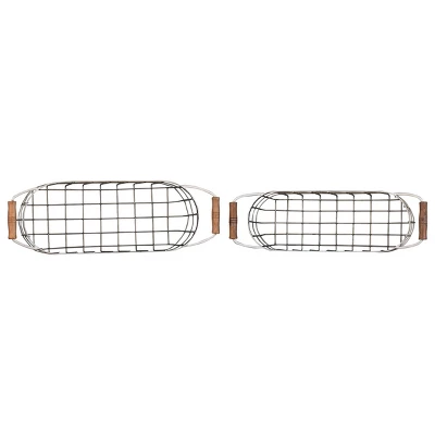 This set of two traditional metal baskets perfectly blends style and functionality. The slightly rustic matte silver wire, paired with the clean white enamel-like rim, and finished with natural wood handles creates a unique and dynamic look. Use these baskets for storage or to add a simple aesthetic element that can easily fit throughout your home. Two different sizes allow for multiple uses, as well as to be easily stacked and stored when not in use.