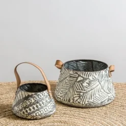 - Design: These metal bins make storing your favorite trinkets and décor easy. Faux leather handles allow for easy carrying to different locations. Use this piece to display dried or artificial plants.