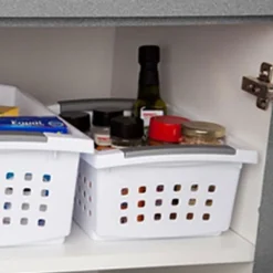Bring back order to your home and to your life with the Sterilite Medium-Sized Stackable Storage & Organization Basket 30-Pack. The Sterilite Storage Basket is ideal for a wide variety of uses including organizing countertops, kitchen cabinets, pantries, and shelving around the home. Store dry goods in your kitchen pantry, organize supplies in the bathroom, or declutter the cleaning supplies under the sink. The contoured handles allow for comfortable transporting, and the smooth finish is easy to clean. Flip-down the accent rails to stack several of these indented bins and maximize vertical storage space. These bins are also the perfect size for containing crafting or office supplies. Try integrating the baskets with a bookcase or with opens shelving to tidy up your child’s books, games, or toys. The Sterilite storage bin is great for the garage, crafts, toys, games, and even fresh pantry items too. Anywhere you need to declutter the Sterilite Storage Basket 30-Pack is your solution.