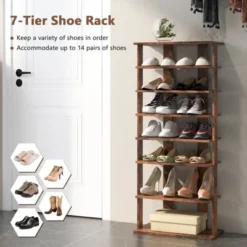 - 7-tier double-row shoe rack can accommodate up to 14 pairs of shoes