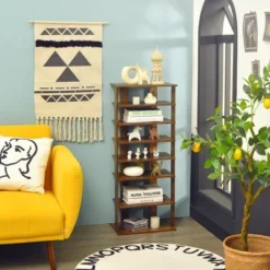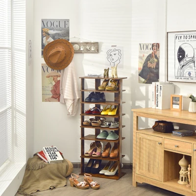 This is our 7-layer shoe rack. The upper layers can be used to place slippers and sports shoes, while the lower layers can be used to place boots and high heels. Of course, you can also remove one layer to place high boots. The vertical design allows our shoe racks to take up no space, and each floor can accommodate two pairs of shoes. Wear this function besides shoe of course, you also can wear it as buy content, put in living room, bathroom, bedroom also is right choice. The high quality density board ensures the stability of the shoe rack, and each layer can hold 11lbs of weight. Shoe wear surface is smooth, waterproof prevents scrape, it is to help you solve the good helper that receives shoe problem.