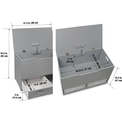 Badger Basket’s multitalented Up and Down Toy Box handles larger toys in the spacious top bin and small items like doll clothes and building bricks in the two baskets below. No more little, lost pieces at the bottom of the toy chest! Smart design tidies up, sorts, and organizes messy clutter and functions as a kid’s bench. Make room for this versatile storage box in your child’s bedroom, or the playroom, family room, or den. Makes a perfect dress-up clothes chest! Quality hardware with safety support hinge that holds the lid open. Handle opening on the front under the lid is a convenient way to lift up the top, and prevent injury when shutting it. Reverse the two-color baskets to customize the look! You may choose not to use the baskets and instead have open cubbies, perfect for books, games, and puzzles. The Up and Down Toy Box is just the right height for kids to easily access their toys, and it’s conveniently down at their level so they can efficiently clean up. Lid opens to full vertical allowing easy access to the 2.75 cubic feet of space inside. Made with engineered wood, fabric, and non-woven fabric. Overall measurements 31.5 inches L x 15.75 inches W x 19 inches H (32.5 inches H with lid fully open). Interior space dimensions: 30.25 inches L x 14.25 inches W x 11 inches H. Baskets (each): 14.5 inches L x 14 inches W x 4.5 inches H. Assembled weight: 39 pounds. All measurements approximate. Wipe and spot clean. Adult assembly required. Product complies with all currently applicable safety standards. Bench supports up to 175 pounds. Product may vary slightly from shown. Props/accessories shown are for illustration purposes only. Product complies with all currently applicable safety standards. Actual color/finish may vary from screen display. This item ships in its original carton that may include a product photo. Soft plastic/rubber toys (such as balls) can react with the finish when left in prolonged contact. Be mindful of what is stored in the unit.