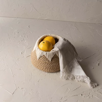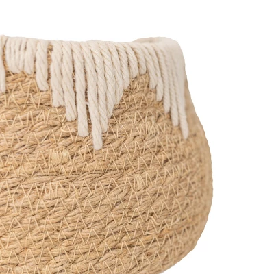 Let this petite jute basket elevate your boho chic decor. Hand made by artisans using traditional weaving techniques, the white cotton rope woven around the top rim creates a geometric pattern that adds a textural layer over the natural jute. Transitional in size and neutral in color palette, this basket can be used for decorative storage of small items, a small potted plant, shelf storage, or a cozy minimalist decorative accent.